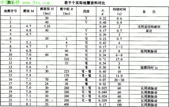 由表1所列出的实震记录资料说明:有的地震地面运动加速度接近0.7g,但由于持续时间短(2s),震级只有4.7级,结构无明显破坏;而有的地震加速度只有0.024~0.0499,但持续时间长达60s,地震烈度达到Ⅵ~Ⅶ度;明显看出地震动持续时间对地震烈度的影响,特别是长周期结构物应该考虑地震动长持时的影响。