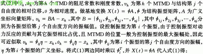 ,n为MTMD中TMD的总数);如果运动起来了。但运动大小,则其所起的作用也相应较小。对于起控制作用的地震波,因为它将成大结构主控振型的动力响应,相应地也会使TMD产生较大的运动,因而会对结构产生较好的控制效果。对结构不起控制作用的地震波由于其携带主要能量的频率成分偏离结构动力响应的主控频率,则它不会放大结构主控振型的动力响应,相应地也不会使TMD产生较大的运动,因而不会对结构产生较好的控制效果,但这无关紧要,因为它对结构的动力反应不起控制作用,这种地震波本来就不属于控制对象。