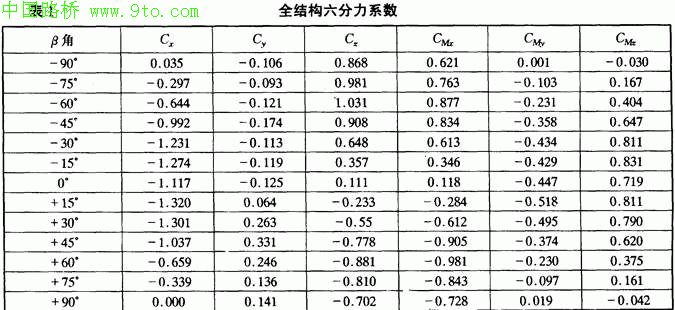 试验表明,在每种β角情况下,由状态一、二、三获得的索塔、边拱和主拱各自的六分力系数之和。均与状态四测得的全结构六分力系数之值吻合良好。这表明,对于此类透风良好的行架结构,各部分之间的流场相互干扰作用微弱,可忽略不计,按前述方法分四种状态测量索塔、边拱、主拱等各自的六分力系数是合理的。试验还表明。每个水平偏角时两种风速下获得的六分力系数基本一致。这说明在此风速范围内雷诺数影响不大,同时也避免了测量中的偶然误差。