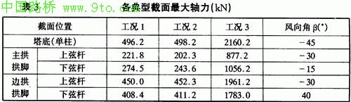 表3给出了工况1、工况太工况3在均匀风速作用下控制截面的轴力。由于非对称风速情况下的内力均较均布风速情况下小,故未列出。而工况4,由于此时已无法约束结构整体平转,其内力计算已失去意义。