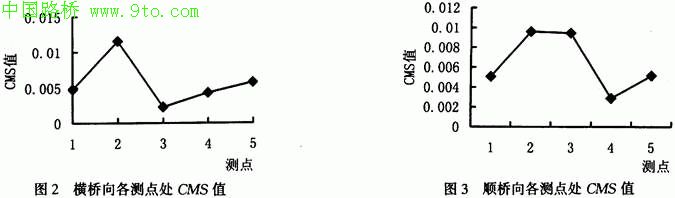 在破损处,CMS值显著大于其余部位的值,检查所有点处的CMS值,就可以确定破损位置,计算结果见图2和图3(图中根坐标代表桥墩测点位置,纵坐标表示所求的破损参数值,以下图式类同)。