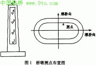 由于检修工作的需要,需在桥墩内安设检修设备。由于墩内要搭设脚手架,需将墩身底部的进料洞(宽0.7m、高1.0m)打开。该进料洞在当初桥墩施工完成后,原已用块石进行了简单的堆砌。在几年的运营过程中,桥墩的自适应过程已经完成。现在如重新打开进料洞,有可能给桥墩造成不利影响,甚至会危及桥梁的运营安全。为此,在进料洞打开前后,对该桥墩进行了两次振动测试。