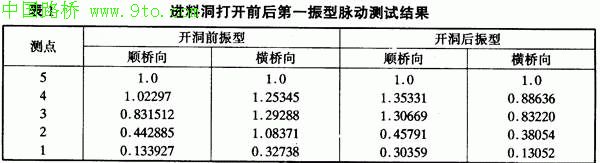 利用脉动法测量的进料洞打开前后桥墩横桥向振动频率分别为f前=1.445Hz,f后=1.523Hz。由于干扰影响,没有得到高阶振型的测试结果。经传递函数分析,进料洞打开前后的第一振型测试结果见表1。