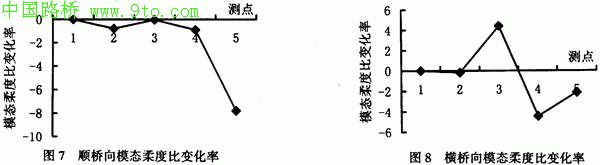 由图2和图3可见,测点2处比其他部位数值大,表明2点处存在局部损伤。可见,用曲率模态振型可以进行破损定位,如能布置足够密的测点,效果会更好。