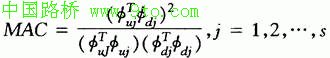 在线监测中,频率是最易获得的模态参数,而且精度很高。通过监测频率的变化来辨识结构的破损是最为简单的,但只有当结构有较大损伤发生对,频率才有明显变化。尽管振型的测试精度低于频率,但振型包含更多的破损信息。利用振型判断结构破损是否发生的方法为:一是直接比较结构破损前后的振型变化;二是采用相关分析中的模态置信度判据[2]: