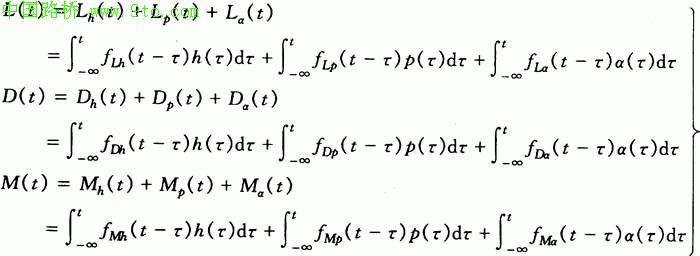 用脉冲响应函数表达的自激力适合于任意形式的振动,也适用于正余弦振动(颤振)。根据在正余弦振动形式下,脉冲响应函数表达的自激力与气动导数表达的自激力相等价的关系,Lin导出了用脉冲响应函数表达的自激力的具体表达形式。以Mα(t)为例,其最终表达式为[7]