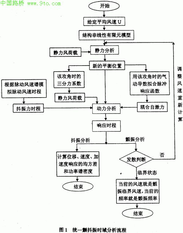 在传统的步域分析方法中,抖振和颜振是通过完全不同的方法来分析的。其中,抖振分析用的是基于随机振动理论的响应谱方法,颤振分析用的是与特征值问题有关的半逆解法或复模态解法。风振时程分析的初衷是为了解决非线性情况下的抖振响应计算。但是颤振分析中所需要的计算自激力的公式在抖振时程分析中都要用到,所以从理论上讲,利用计算抖振时程分析的方法同样可以在时域中计算颤振。实际上,抖振和颤振并不是完全独立的。在任何风速之下,桥梁都受到抖振力和自激力的作用。当风速较低时,自激力很小,不起控制作用,桥梁的振动就体现为抖振。当风速增加到一定程度时,自激力逐渐发散,并控制桥梁的运动,桥梁就发生了颤振。因此,只要正确地描述了抖振力和自激力,运用时程分析这一仿真的分析方法,就可以算出一定风速之下桥梁的真实运动状态。如果表现为随机振动,则说明是抖振,我们就可以得到响应时程统计指标。如果是发散振动,就说明桥梁发生了颤振。只要不断进行搜索计算,我们就能在时域中找到桥梁的颤振临界风速。