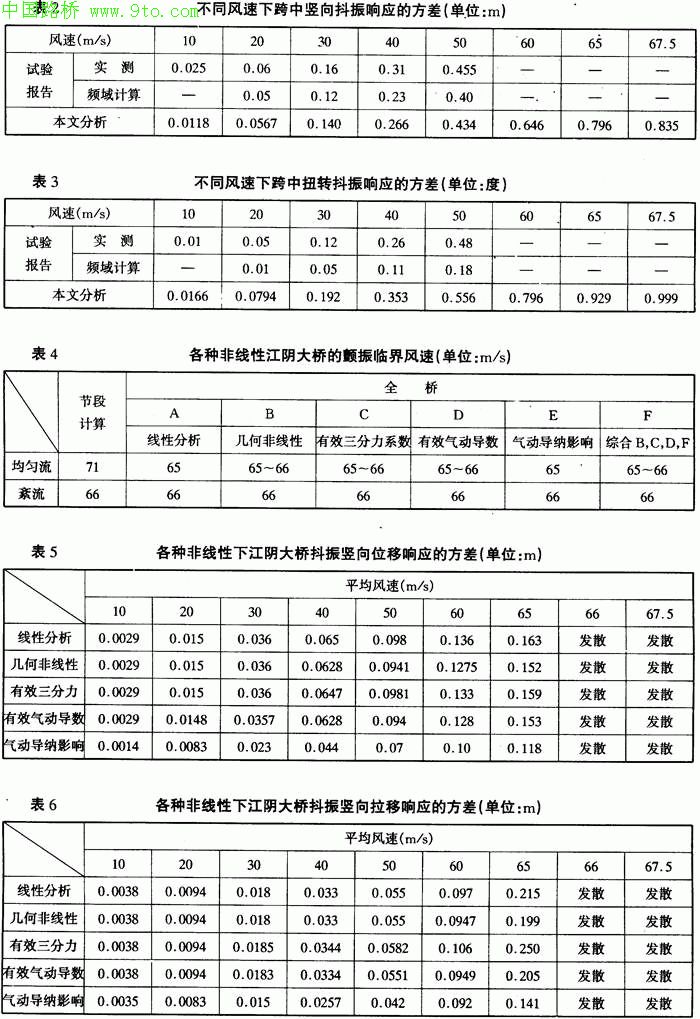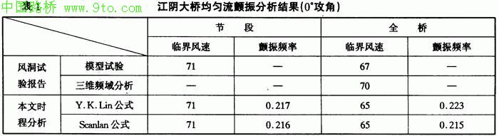 江阴长江大桥主跨1385m,是我国目前在建的跨度最大的桥梁。丰文运用Nbuffet程序,分析了该桥不同参数下的颤振和抖振响应,并与用其他方法得到的结果进行了比较。结果显示,本文建立的统一的颤振和抖振分析方法在理论上和实践上都是成功的。本文所编制的Nbuffet程序也是实用可靠的。以下分别是运用传统频域分析方法、风洞模型试验和本文的方法分析得出的一些结果对比情况。限于篇幅所限,本文未给出与表中数据对应的曲线图。从结果对比可以看出本文的计算结果与频域分析方法、风洞模型试验的结果基本吻合(表l~表3)。本文的主要目的是建立一套时域内颤振和抖振统一分析的方法和流程。从比较结果来看,这种方法和流程是成功的。
