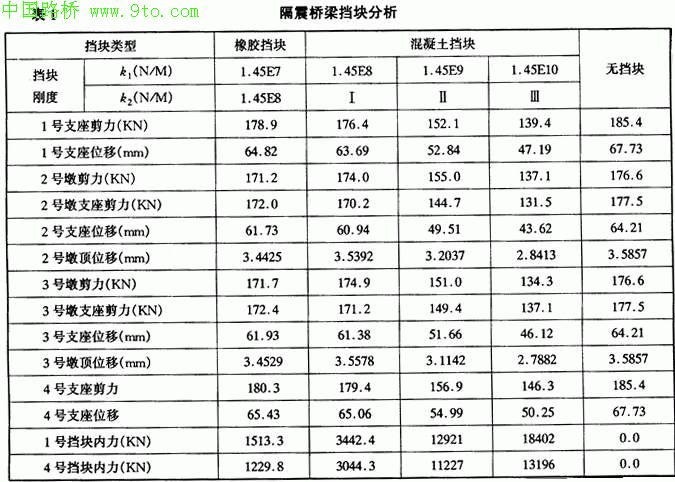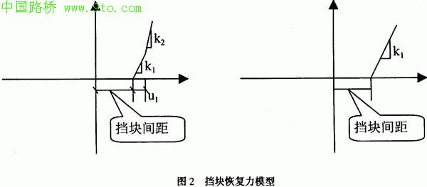 从国内目前的研究情况看,研究的比较少。同济大学叶爱君在博士论文中对纵横向挡块设置方式进行了分析比较,桥台在纵向对主梁的限位作用对整体结构的抗震是有利的,横桥向挡块与主梁间不设间隙对桥墩抗震是有利的,橡胶挡块的设置可降低桥墩的受力。从我国目前的规范可知,在桥梁的抗震分析和设计中均不直接考虑构造措施对结构动力响应的影响,仅是从构造要求而设置,但这可能存在以下几个问题: