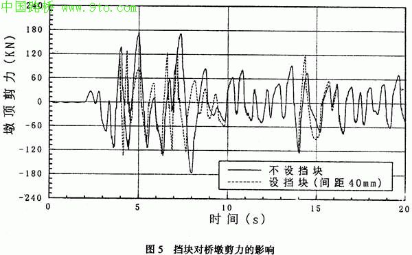 从表1可知,当在上部结构梁两端桥台处设置限位挡块后,各桥墩处上部结构与墩顶的相对位移确实得到了约束,但在限制位移的同时,设置挡块的桥台也同时承担了很大的冲击力。总的说来,在连续梁桥纵桥向设置挡块,对于不设档块的其它桥墩,所承担的惯性力有减小的趋势,但对于设置挡块的桥台或桥墩,在挡块发挥作用时,由于上部结构与挡块的碰撞,将承担较大的冲击力,且随挡块刚度的增加,在增强限位能力的同时。挡块的抗力和设置挡块的桥台或桥墩所承担的力也跟着迅速增大。图3给出设置不同刚度的挡块时,挡块的抗力及碰撞随时间的变化关系图。从图中可直观看出,挡块刚度增加,挡块抗力峰值增大,且挡块与上部结构相互作用的时间也缩短,即冲击力增加。因此,在设置挡块时,对挡块刚度的选择应给予注意。此外,为了比较橡胶挡块和混凝土挡块对隔震桥响应的影响,分析中取橡胶档块的第二刚度与混凝土挡块的刚度相同,挡块间距相同的条件下进行响应分析,从图3中橡胶挡块与混凝土挡块的响应值可知,由于橡胶挡块初始刚度较低,起到了应有的缓冲作用,橡胶挡块的内力和设有挡块的桥合所承担的惯性力同混凝土挡块相比显著降低,但其对上部结构与墩顶相对位移的约束也有所减弱。图4.5给出设置挡块后隔震桥动力响应与不设档块动力响应的比较,从图中可直观看出,挡块的设置,在其发挥作用限制上部结构与敬顶相对位移的同时,改变了桥墩的受力,即结构的响应特性发生了变化。