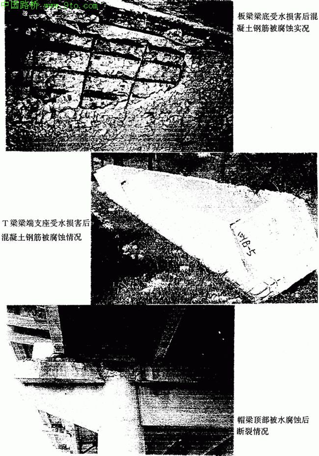 过去采用的伸缩缝形式基本上都是漏水的,由伸缩缝处渗漏下的水往往流到梁端,再流到帽梁,对梁端和帽梁顶部混凝土产生严重的腐蚀,这一现象几乎在每一座桥上都可以见到,八里台立交桥、解放南路立交等就是最明显的例证。京福公路东州大桥在1999年6月27日北起第十墩T型帽梁翼板南侧西部突然断裂,主要原因就是水从伸缩缝处流到帽梁上,腐蚀了上部混凝土和钢筋造成的。