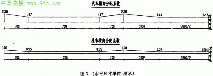 为了计算每一个箱子在全桥长度上的横向分配系数,接等代刚度法将本桥等代成34+48+34m三跨等截面简支梁,再以简支梁作为受力模型,用刚结板法计算每个箱子的横向分配系数,然后,将各跨的横向分配系数综合起来得到每一个箱子在全桥长度上的横向分配系数,具体使用程序为本院正交预应力混凝土简文梁桥设计计算程序《SBBD》,计算结果见图3。