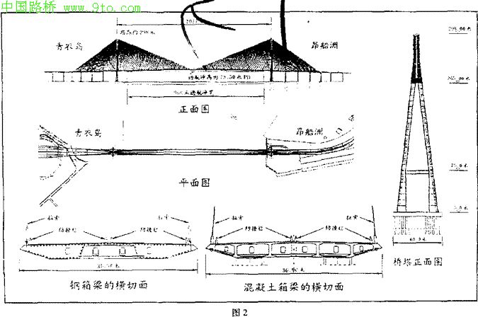 此方案是一座H形桥塔的斜拉桥.桥塔在加劲梁以上不设横梁。大桥的主跨为100lm,边跨是300m,全桥的总长度为1601m。拉索以半扇型的形式分布于两个垂直的平面。全桥均采用钢箱梁,在边跨的钢箱梁加进混凝土以增加重量来平衡主跨的恒载。由于桥柱离桥面特高而没有横梁,这个方案在设计和施工上显得较为特别。