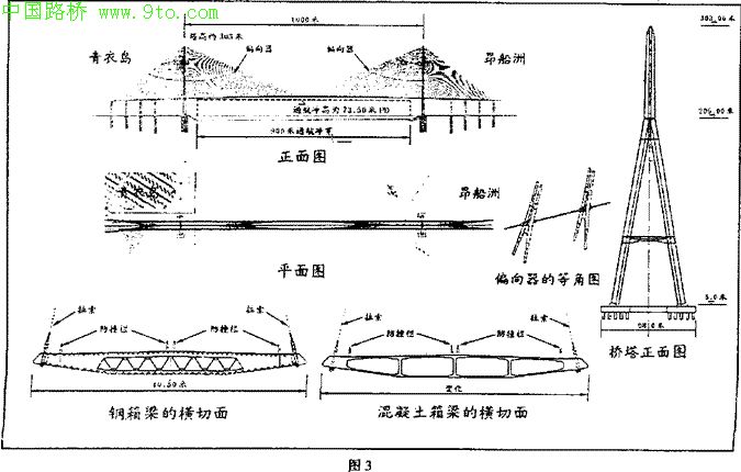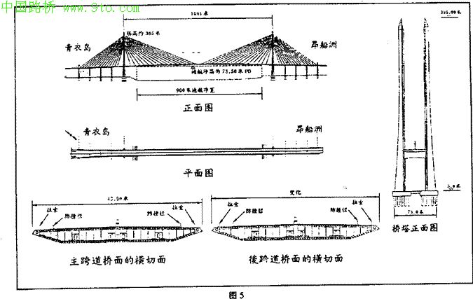 五个第二阶段的设计均为斜拉桥方案。主跨由1000m至1019m,全桥总长都在1600m左右。他们的设计均有特色。笔者在此简单介绍每个方案的特点。