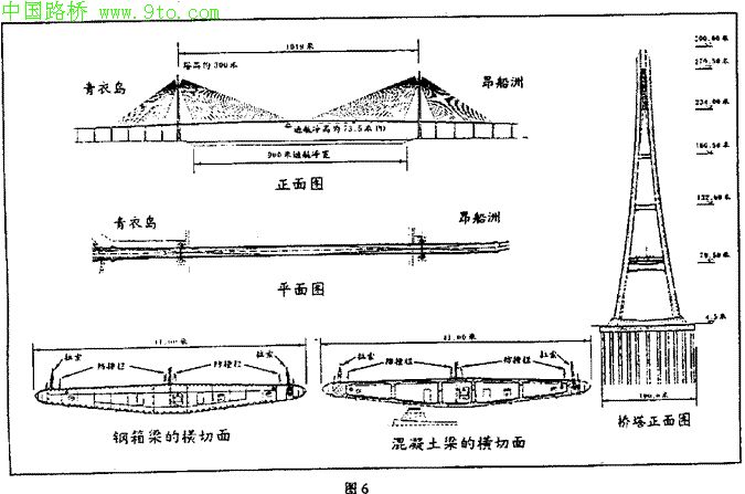 此方案是一座像烟通形状桥塔的斜拉桥,桥塔上部的112.5m是钢结构而之下的部分是混凝土结构。大桥主跨为1018m,边跨分别是298rn。全桥的总长度为1616m,拉索以半扇型的形式分布。加劲梁在边跨和近桥塔24m的主跨是采用双箱混凝土梁。在主跨其余部分则采用双箱钢梁,双箱钢梁由横架连在一起。总体而言,这个方案在设计和施工上均为一个较新颖的方案。