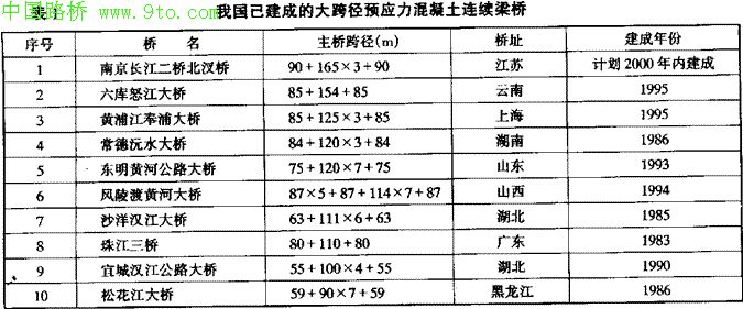 预应力混凝土连续梁桥是预应力桥梁中的一种,它具有整体性能好、结构刚度大、变形小、抗震性能好,特别是主梁变形挠曲线平缓,桥面伸缩缝少,行车舒适等优点。加上这种桥型的设计施工均较成熟,施工质量和施工工期能得到控制,成桥后养护工作量小。预应力混凝土连续梁的适用范围一般在150m以内,上述种种因素使得这种桥型在公路、城市和铁路桥梁工程中得到广泛采用。目前我国已建成的有代表性的大跨径公路和城市预应力混凝土连续梁桥如表1所示。