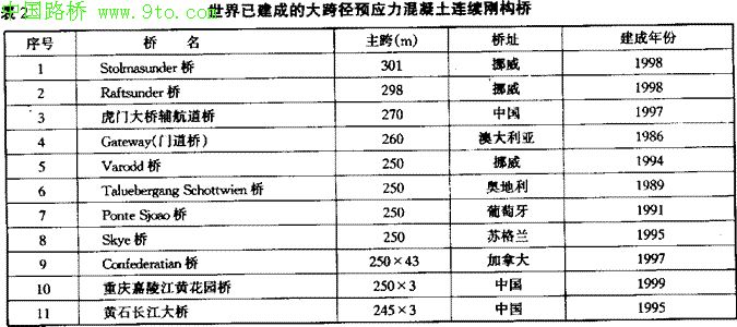 虽然本文论述的重点是设置支座的预应力混凝土连续梁桥,但有必要简要介绍一下由T型刚构体系与连续梁体系结合而成,采用薄壁柔性桥墩、墩梁团结的预应力混凝土连续刚构桥。这种桥型上部结构的受弯性能与连续梁基本相同。由于墩梁固结,主墩不设支座,顺桥向抗弯刚度和根桥向抗扭刚度较大,能满足特大跨径桥梁的受力要求,从而使得预应力混凝土梁桥的跨径适用范围从连续梁桥的150rn左右,发展到300rn以上。表2列出目前世界上已建成的大跨径预应力混凝土连续刚构桥。