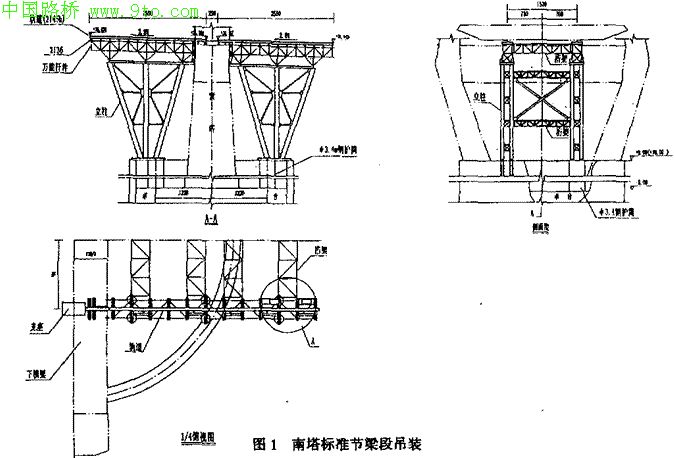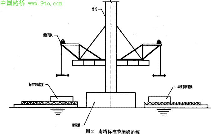 (1)索塔下横梁处零号块钢箱梁,通过架设施工托架,用450t浮吊吊运安装。