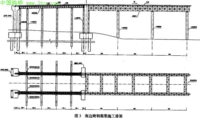 4m的桁架,长度为82m。由3排φ2.6m的钢管钻孔桩支撑。为增加移梁时的稳定性,两组万能杆件桁架每隔14m横向用槽钢组成的桁架连接。