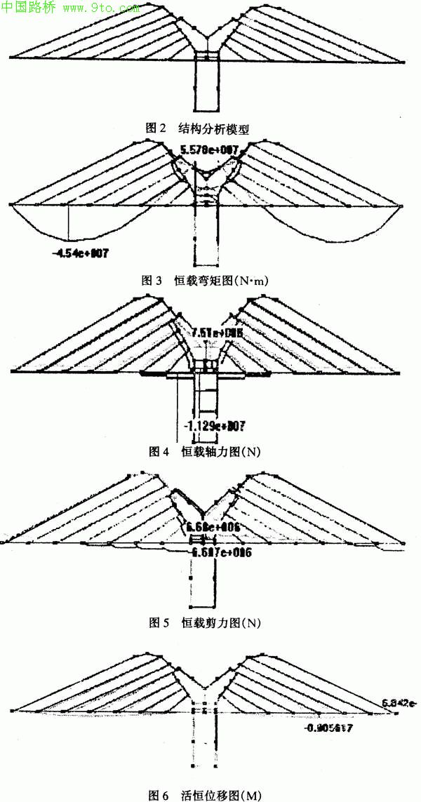 由图3,4,5可以看出:在恒载作用下,最大弯矩发生在约1/4跨径处,最大负弯矩发生在墩顶处的主梁截面;最大剪力发生在塔根处;最大轴力发生在桥塔根部,桥塔上拱肋的拉力亦在控制设计值之内。