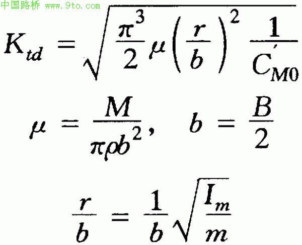 其中, m为单位桥长质量(kg/m);此为单位桥长质量惯矩 (kg·平方米/m); CMO为在攻角α=0度时升力矩系数CM的斜率,由风洞试验测得;ft一般取一阶对称扭转频率(Hz)。