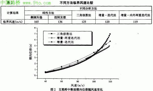 2。图 2为采用不同方法计算出的结构主梁跨中断面横向位移随风速的变化(因侧倾失稳和扭转发散两种方法无法跟踪结构失稳的全过程,故未列出)。为了更好地说明本文所提的增量一内外两重迭的代法的稳定性,分三种不同的初始风速加载方式考察了结构静风响应,其中方式一为风速从40m/s开始,每次增加