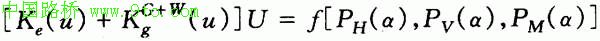 式中,Ke和Kg分别为结构的线弹性和几何刚度矩阵;α为有效攻角。PH,PV,PM分别为体铀下的风阻力、升力和升力矩;f为函数因子;上标G和W分别代表重力和风力。