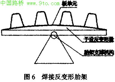 由于加劲的偏于腹板一侧,焊后易在竖板上产生蕈状变形,因而焊接时需将横隔板固接于平台上,施加约束,以控制焊接变形的产生。