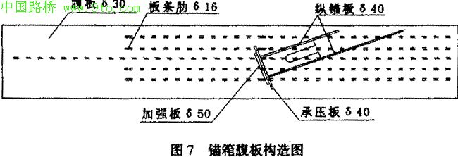 钢箱梁上的荷载均通过腹板外侧的锚箱传递给斜拉索和桥塔,因而锚箱腹板是钢箱梁最重要的受力构件。全桥共有80对柱状锚箱,其角度和纵锚板长度因箱段的位置而变化。锚箱腹板由腹板、承压板、纵锚板、腹板板条肋等组成。锚箱结构如图7所示。