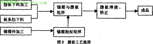 腹板组焊板条肋后,依据纵、横基准线精确定出锚箱的组装位置及组装角度,并据此在平台上组装锚箱。
