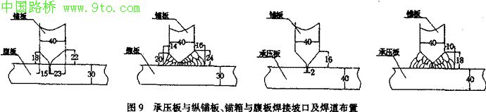 承压板与纵锚板、锚箱与腹板间均为熔透焊缝,采用开双面U型坡口焊接,坡口及焊道布置见图9所示。焊接时采用手工多道焊,焊条采用SHJ507Ni焊条。焊前预热100~150℃,层温控制在100~150℃。一侧焊后另一侧进行清根处理,确保熔透。