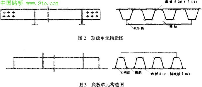 顶板、底板、斜底板单元均带有U型加劲肋,主要结构形式为正交异性板结构,由面板和纵向加劲的U肋和横向加劲的横肋组成,构造见图2、图3所示。其制造工艺基本相同。