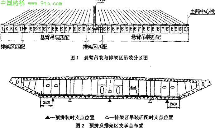 钢箱梁吊装顺序:钢梁吊装分为两个阶段,第一阶段是排架区梁段的吊装,通过350t浮吊完成吊装作业;第二阶段是悬臂吊装(包括边跨合龙和跨中合龙),通过桥面吊机完成吊装作业。见图1所示吊装分区。