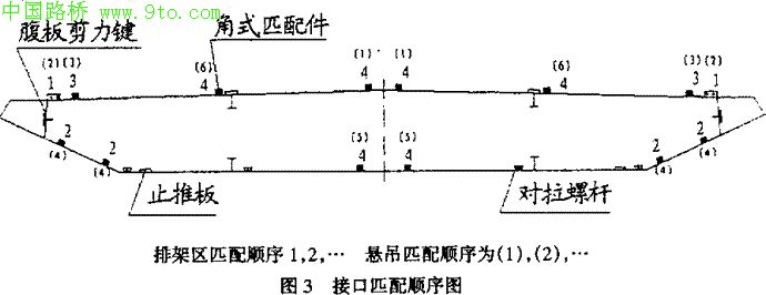接缝隙的前提下相互勾借);④用千斤顶使待匹配箱口主腹板平齐,通过边顶板处对拉螺杆根据桥轴线情况调整检查线;⑤复测标高合格后,接口其他匹配件按图3所示顺序连接完成,装焊腹板剪力键,测量桥轴线。⑥依据线型情况决定环缝焊接顺序。