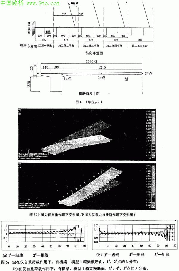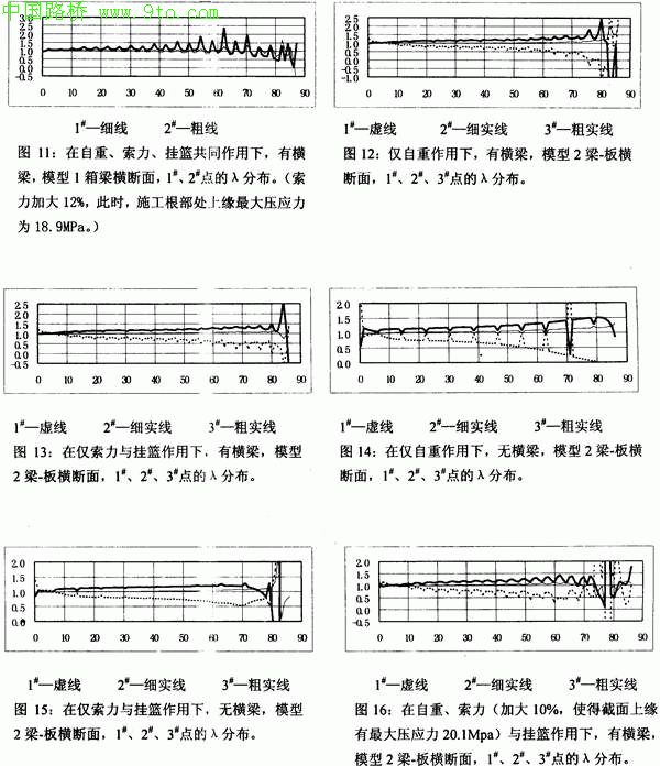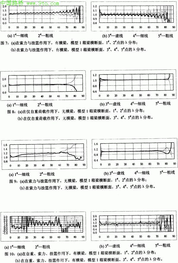 ①从分离式双箱梁截面在自重作用下上缘与下缘的λ比较说明:在不管有无横梁的情况下,上缘比下缘剪力滞效应要大些,上缘λ值可达到1.6,而下缘λ值基本在0.9-1.10之间,也就是验证了剪力滞效应与板的宽度有关,当上缘板较宽时,其剪力滞效应力将更大些,可以对比图6与图8,图中1号一5号点在横截面上的位置见图2;