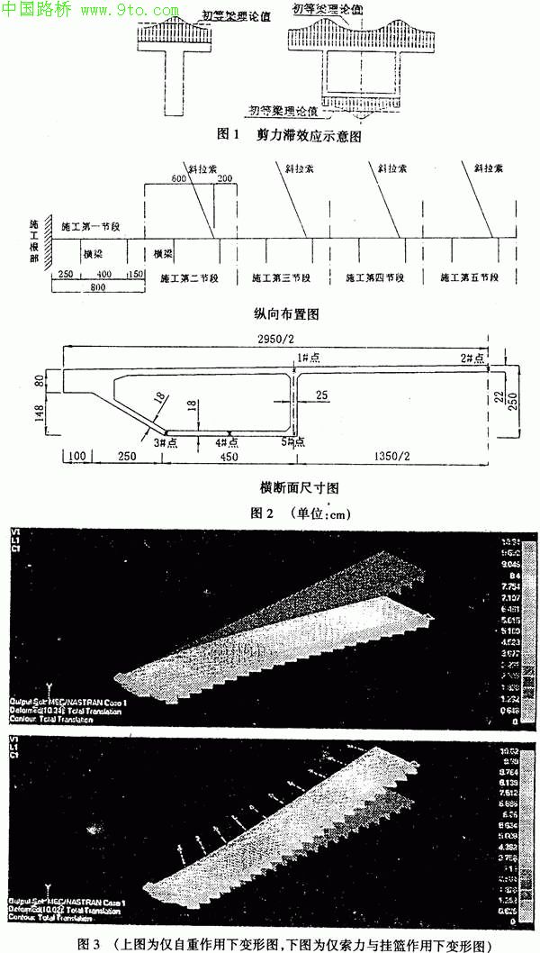 1.在斜拉桥主梁悬臂施工中,由于在自重、索力、施工临时荷载等作用下,当主梁截面较宽时存在较大的剪力滞效应,在设计中应该予以重视;