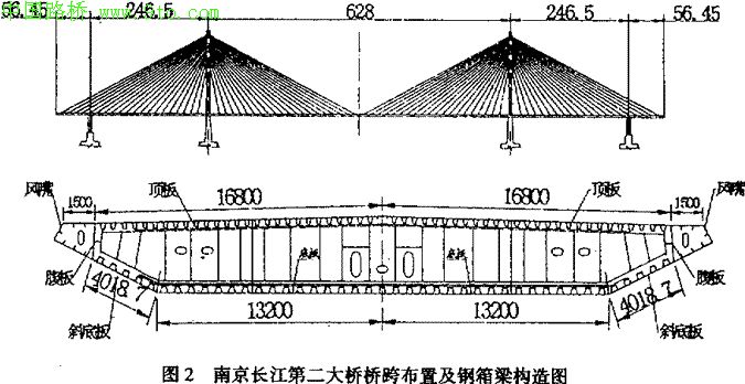 南京长江第二大桥南汊桥,见图2。该桥是五跨连续钢箱梁斜拉桥,全长1238m,主跨628m,桥宽38.2m,梁高3.5m。钢箱梁长度6~15m,最大重量