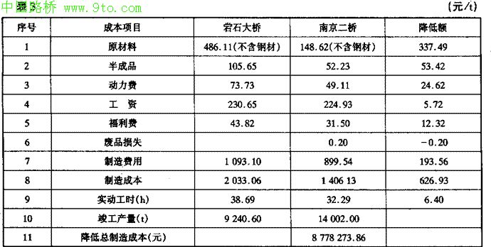 433.37元/t,固定成本降低193.56元/t,制造成本降低626.93元/t,劳动效率提高了10.27%,按厂内南京二桥竣工产量14002t计算,共计降低总制造成本879万元,经济效益明显。另外,加快了进度,缩短了板块制造工期,为南京二桥钢箱梁的总体预拼装赢得了时间,使桥位钢箱梁吊装得以顺利进行。