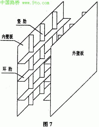 从图中可以看出,双壁铜围堰主要由内壁板、外壁板、内环板、外环板、隔舱板、竖肋和水平斜撑等部分组成。
