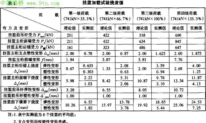 4级加载。每级加载半小时稳定后,测量各测点变形值。卸载后测量非弹性变形,各测量值与理论值比较,评定挂篮的工作性能(表1)。
