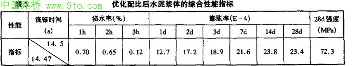 通过上述两大系列试验,我们确定灌浆用水泥浆体的优化组合配比为:JM-Ⅲ掺量8%、水胶比0.35,其综合性能如表5。