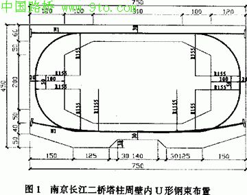 塔柱中的锚固区段,应力集中,为控制裂缝,采用了后张有粘结U形预应力。南京长江二桥的U形预应力特点为:由曲率半径为1.55m的U形钢束交互而成(图1)。