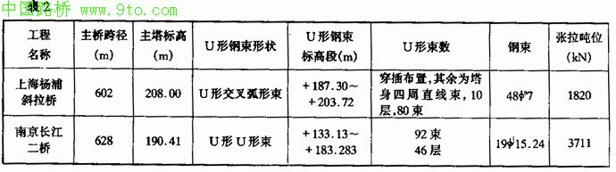 最近几年,在大跨径斜拉桥的索塔上塔柱中,在拉索锚固区中施加U形预应力成为新的热点,南京长江二桥U形预应力与已施工的上海杨浦大桥U形预应力的对比见表2。