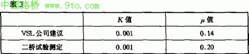 结合上塔柱1:1模型段的试张拉试验,试验得出的二桥U形PT-PLUS塑料波纹管的k,μ值与VSL公司建议值有差异,其对比见表3。