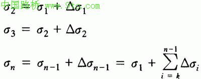 根据上述思路,空钢管骨架承受自重产生的应力(假定为σ1),压注管内混凝土阶段钢管应力则是管内混凝土恒重及施工荷载产生的钢管应力(假定为Δσ1)与σ1之和(假定为σ2);在下一阶段的施工中,钢管的应力则为下一阶段慎重及施工荷载产生的钢管应力(假定为Δσ2)与σ2之和,即