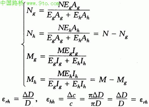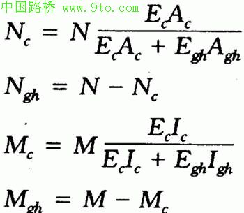 设钢管混凝土的弹模、面积、惯短分别为Egh,Agh,Igh,外包混凝土的弹横、面积、惯矩分别为Ec,Ac,Ic,其中,惯矩由相应组分对截面形心取矩而得。Nc,Mc是外包混凝土承担的轴力和弯矩,Ngh,Mgh则是钢管混凝土承担的轴力和弯矩。则