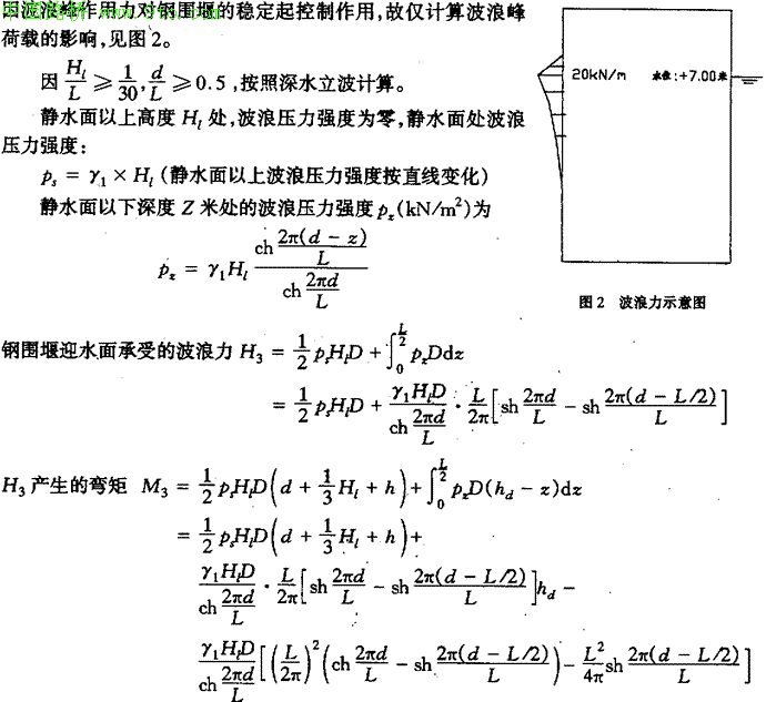 在目前的《公路桥涵设计规范》中,对江河流域中墩台承受风浪力荷载尚没有明确的计算方法,但根据南京市气象台的资料,在南京长江水域中,在大风的作用下,确实有浪高2.0m的风浪发生,钢围堰安全渡洪至关重要,因此,在钢围堰滚洪分析计算中,考虑波浪力对钢围堰稳定的影响。