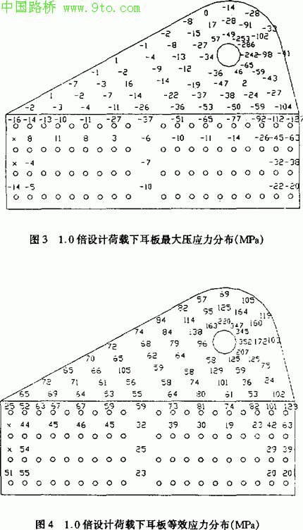 1.0倍设计荷载下耳板最大压应力和等效应力分别如图3和图4所示,图中数字中心为贴应变片的位置,“o”表示螺栓,"X"表示应变片失效。