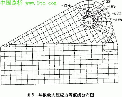 在桥的纵向取24m长,包括6个节间的梁段,鉴于钢箱梁和索关于桥轴对称,在桥的横向取箱梁的一半,利用有限元计算程序ALGOR,采用板壳单元建立计算模型,运行程序进行计算。耳板的最大压应力等值线分布如图5所示。