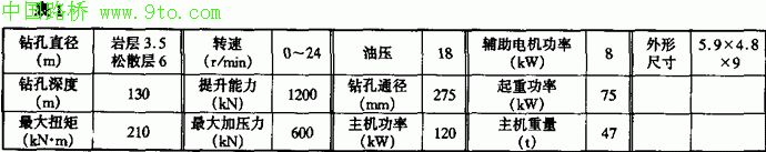由于覆盖层较厚,嵌岩较深,经比较分析,选用了KP3500型全液压转盘式钻机,其主要技术参数见表1。